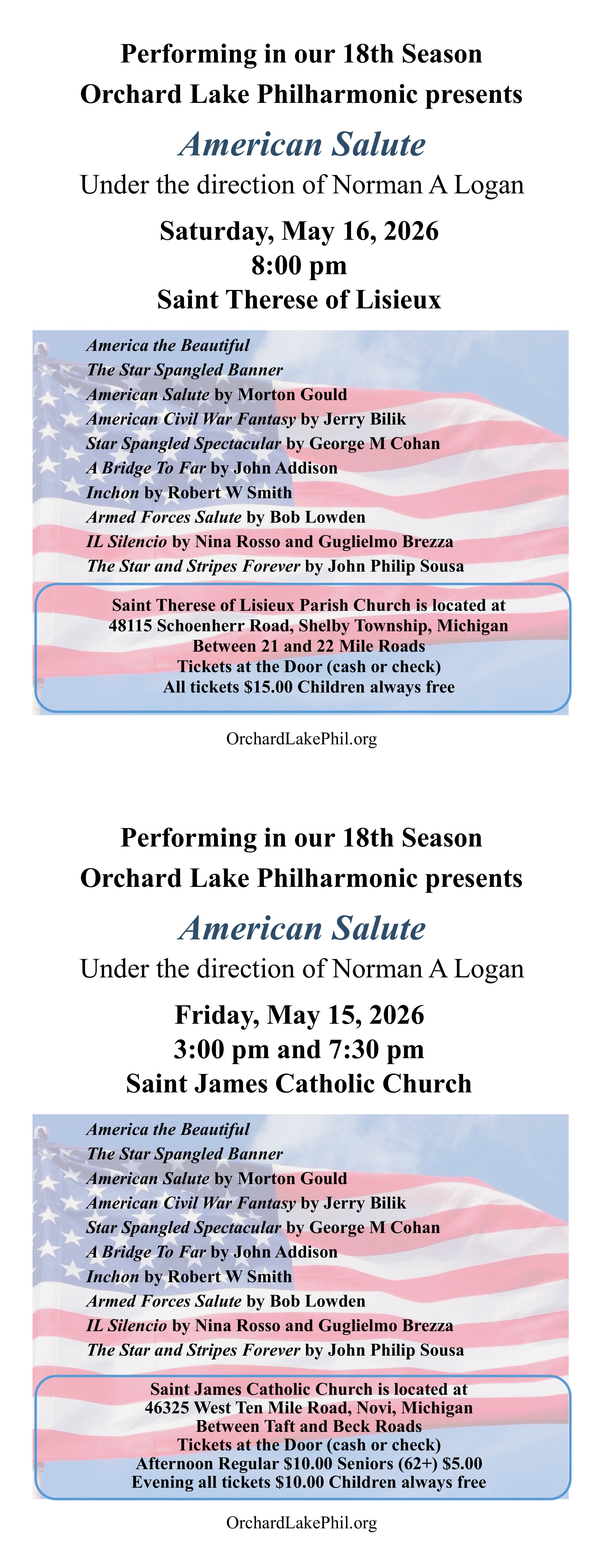 Friday, May 15 St. James Catholic Church, Novi, MI 3:00 and 7:30 pm